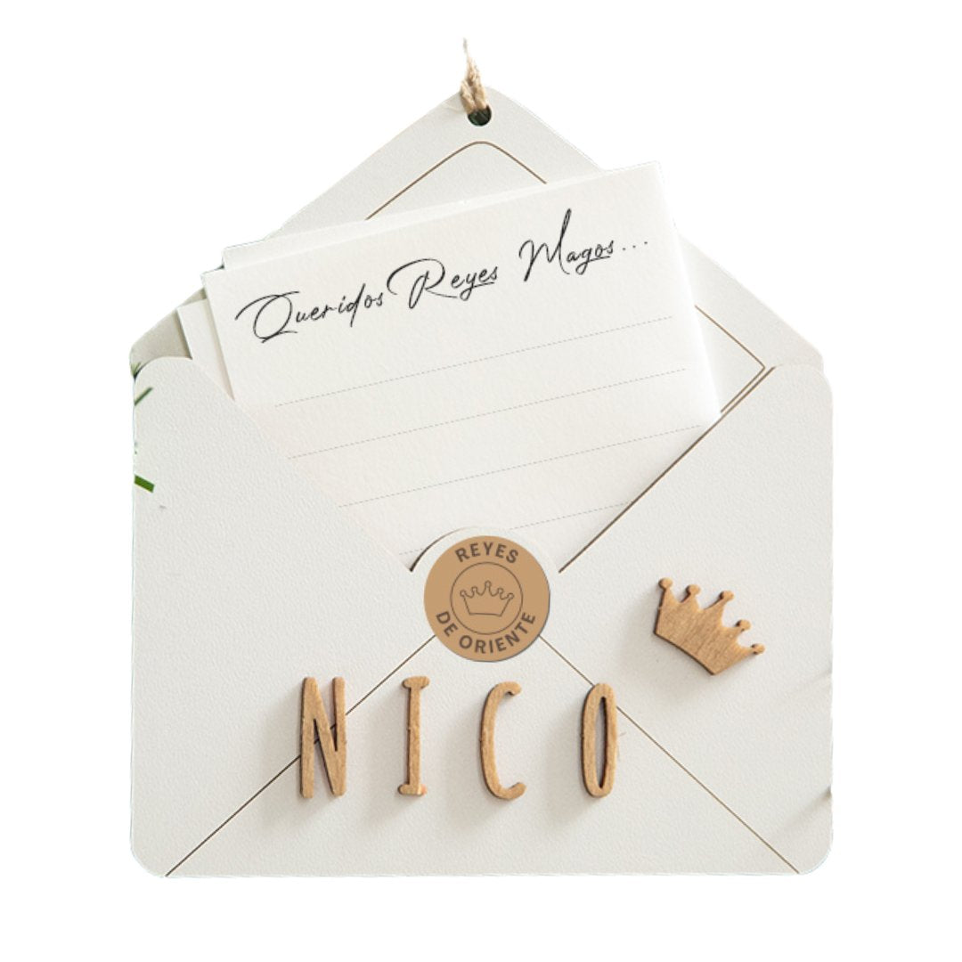 - Incluye: Kit de letras y detalles para personalizarlo y cordón de yute para colgar en el árbol de navidad. Además incluye dos sellos para pegarlos según el destino de la carta: Reyes de Oriente o Polo Norte