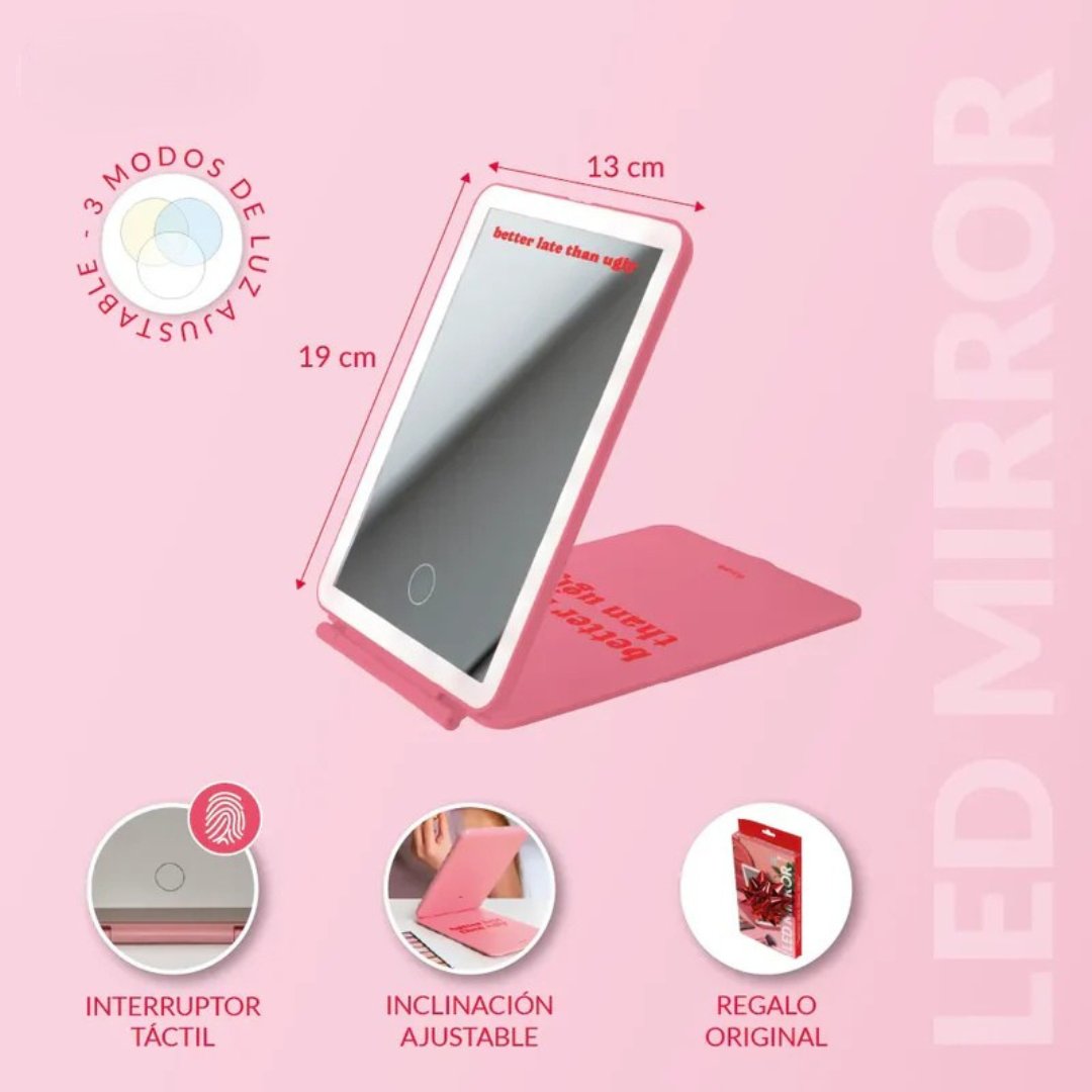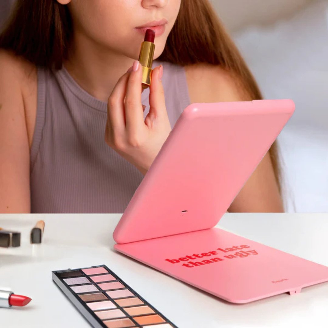 💋 Espejo LED portátil – “Better Late Than Ugly”