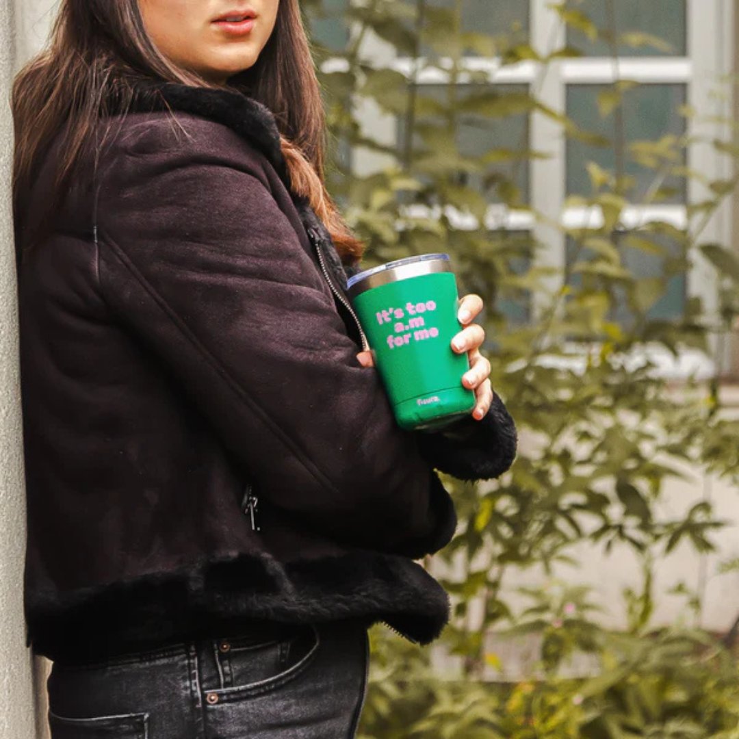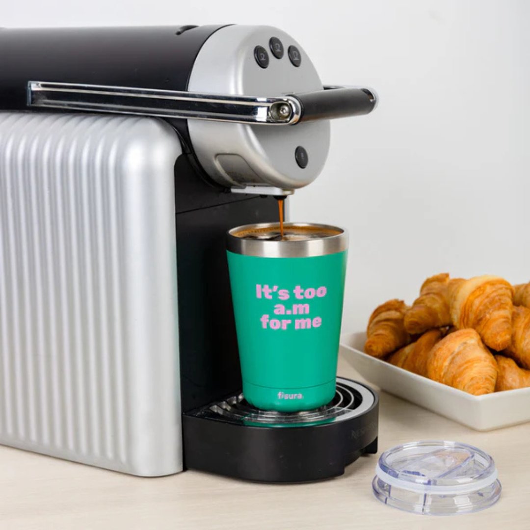 Si las mañanas no son lo tuyo, este termo está hecho para ti. El vaso termo "It’s too A.M. for me" de Fisura combina humor, diseño y funcionalidad para acompañarte en el día a día.
